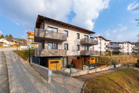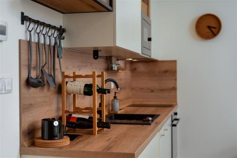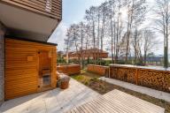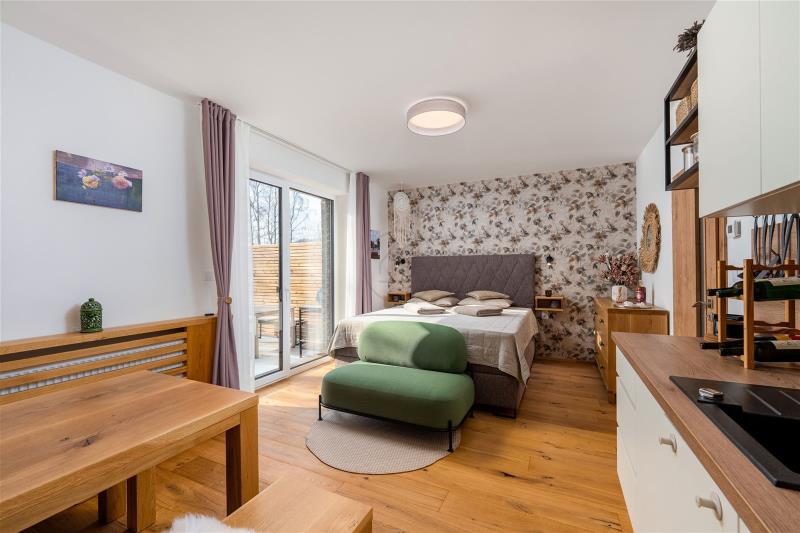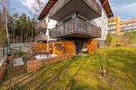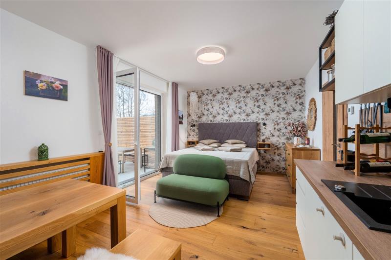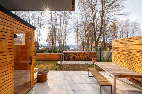 Dispozičně je apartmán řešen s důrazem na funkčnost, dostatek světla a přímé propojení interiéru s exteriérem prostřednictvím terasy a velké zahrady. Ze zádveří a chodby s šatnou navazuje koupelna s WC. Dále prostor přechází do hlavní obytné části spojené s kuchyní, ze které je vstup na prostornou terasu a zahradu. Zde naleznete ideální zázemí pro relaxaci: zahradní nábytek, vlastní saunu, venkovní sprchu a okrasné záhony. Zahrada nabízí výhled na hladinu jezera a nachází se ve velmi klidné části obce, přesto v pohodlné docházkové vzdálenosti na pláž i do samotného centra Lipna.