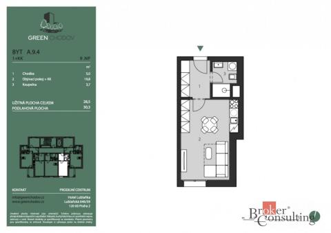 Představujeme vám rezidenční projekt Green Chodov – spojení komfortního městského života s klidem přírody. Moderní architektura, vysoký standard a atraktivní lokalita dělají z Green Chodova jedinečné místo pro bydlení i investici. 5 důvodů proč – Green Chodov Jaké jsou největší lákadla a co kupující milují nejvíc? • Mimořádná lokalita – pár minut chůze na metro Chodov či Roztyly, 2 autobusové zastávky přímo u domu, v budoucnu i plánovaná tramvajová trať. • Vše po ruce – Westfield Chodov, supermarket i veškerá občanská vybavenost v pěší dostupnosti. • Harmonie s přírodou – přímé napojení na park Trojmezí a přírodní jezírko pro relax i sport. • Vysoký standard – rekuperace ve všech jednotkách, klimatizace ve vyšších patrech, dřevěné podlahy, sádrové omítky, předokenní žaluzie a nadstandardní výška stropů min. 2,75 m. • Pro každého – od praktických 1+kk a 2+kk až po exkluzivní mezonety. Projekt Green Chodov se skládá z 11podlažního bytového domu a 2podlažního polyfunkčního domu se společným podzemním parkováním. Je ideální jak pro vlastní bydlení, tak i jako bezpečná investiční příležitost – díky blízkosti metra, administrativních center a přírody. Projekt byl nominován na Realitní projekt roku 2025, což potvrzuje jeho výjimečnost a kvalitu. Exkluzivní nabídka – poslední svého druhu Nabízená jednotka je poslední dostupný byt s dispozicí 1+kk a podlahové ploše 30 m² v celém projektu. Jednotka se nachází v 9. nadzemním podlaží, což zajišťuje dostatek světla, klid a atraktivní výhled. Tento byt představuje ideální startovací bydlení pro jednotlivce či pár, zároveň však i vysoce likvidní investiční příležitost s dlouhodobým potenciálem. Kombinace vysokého patra, kompaktní dispozice a prémiové lokality z něj dělá mimořádně velmi žádaný typ nemovitosti.