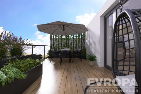 Disp.: zádveří 3,6 m2, šatna 2,2 m2, kuchyň a obývací pokoj 22,0 m2, koupelna 3,6 m2, balkon 21,5 m2.