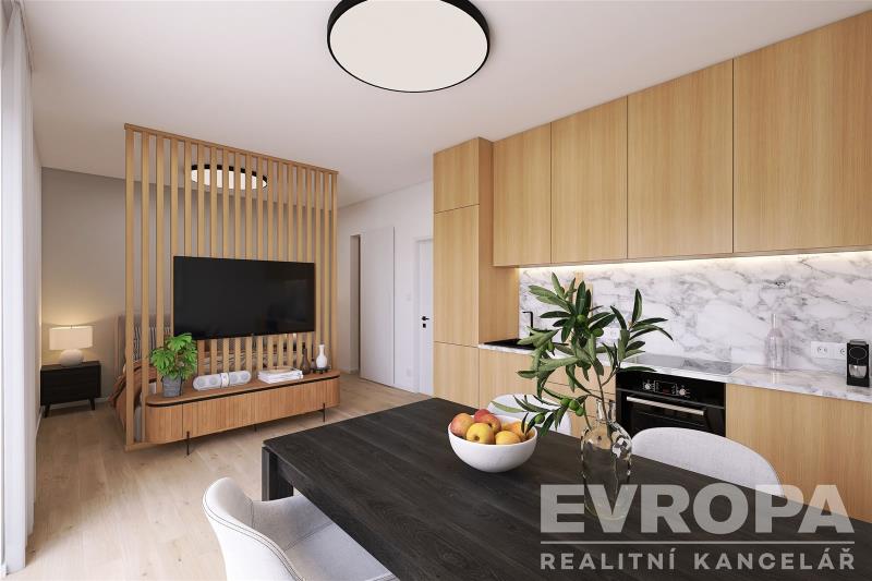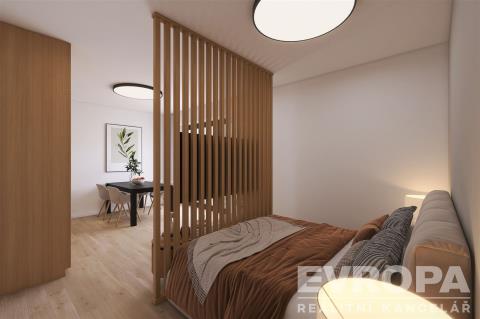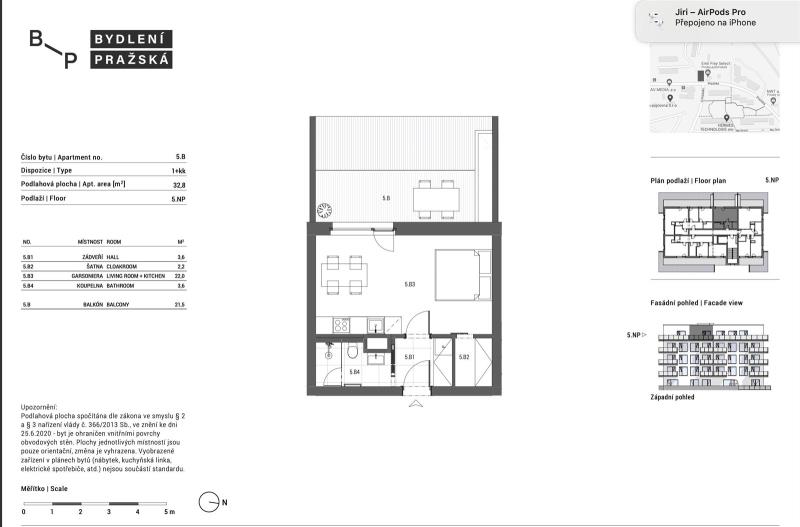 Byt se nachází ve 5.NP s výtahem. Byt o dispozici 1+kk s plochou 32,8 m2 a balkonem o velikosti 21,5 m2. Byt je umístěn na Z.