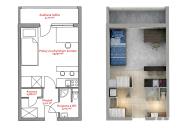 - Hlavní obytný prostor s kuchyňským koutem (cca 20 m²) - kuchyň je prakticky oddělena ostrůvkem, který slouží jako jídelní i pracovní plocha. Přirozeně dělí kuchyň a obytnou část, což nájemníci oceňují.