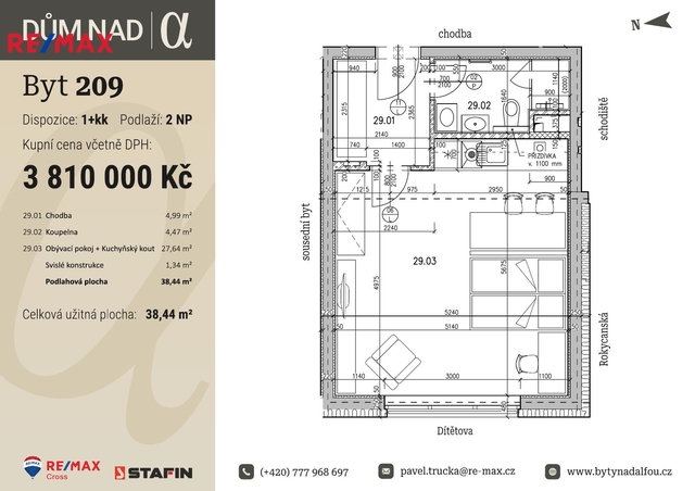 2.09 Nabízíme k prodeji moderní byt 1+kk s bezbariérovým přístupem, který se bude nacházet ve II. NP novostavby s výtahem, která vzniká v Plzni na Doubravce na křížení ulic Dítětova a Rokycanská v blízkosti Divadla Alfa. Celková užívaná plocha činí 38,44 m2 a sestává z podlahové plochy bytu 38,44 m2 vč. svislých konstrukcí 1,34 m2. Tento byt tvoří obývací pokoj s prostorem pro kuchyňskou linku o výměře 27,64 m2, koupelna se sprchovým koutem a WC o výměře 4,47 m2 a chodba o výměře 4,99 m2. Momentálně si lze v uvedené ceně vybrat doplňky jako podlahové krytiny, dekor dveří, obklady, dlažby a sanitu, a to ze zvolených standardů, popř. si připlatit za jiné dle vašeho výběru. Ve společném garážovém prostoru se bude nacházet několik parkovacích míst, o jejichž aktuální dostupnosti Vám poskytneme více informací na dotaz. Energeticky chytrý dům – moderní kombinace plynového zdroje tepla a FVE umístěné na střeše objektu = výjimečný systémem zajišťující uživatelům levnější provoz rozdělováním výroby elektrické energie použité v bytech, společných prostorách a následně pro ohřev vody na TUV a teplo v kotelně. Jelikož se jedná o moderní dům, energetická náročnost budovy vychází na B, okna jsou plastová s izolačními trojskly, el. v mědi (230 V / 380 V do kuch. koutu), rozvody vody a kanalizace v plastu, dveře a zárubně zn. Sapeli a domofon s funkcí videofonu. Pro případné venkovní stínění na elektrický pohon je provedena elektroinstalace s přerušeným tepelným mostem. Dům bude disponovat optickým rozvodem pro internet. Kupní cena je uvedena vč. DPH. Více informací lze zjistit na webových stránkách projektu nebo u makléře nabídky. Stavba má být dokončena v červenci 2027, zkolaudována a k nastěhování od října 2027. Investorem a generálním dodavatelem celého projektu je společnost STAFIN a.s.