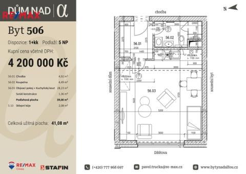 Celková užívaná plocha činí 41,08 m2 a sestává z podlahové plochy bytu 39,00 m2 vč. svislých konstrukcí 1,36 m2 a sklepní kóje na patře o výměře 2,08 m2. Tento byt tvoří obývací pokoj s prostorem pro kuchyňskou linku o výměře 28,23 m2, koupelna se sprchovým koutem a WC o výměře 4,49 m2 a chodba o výměře 4,92 m2. Momentálně si lze v uvedené ceně vybrat doplňky jako podlahové krytiny, dekor dveří, obklady, dlažby a sanitu, a to ze zvolených standardů, popř. si připlatit za jiné dle vašeho výběru.