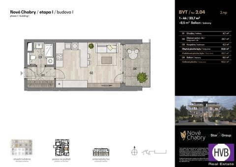 Nabízíme k prodeji nový byt v osobním vlastnictví o dispozici 1+kk, o celkové výměře 33,7 m² s balkónem o velikosti 8,5 m². Byt se nachází ve 2. nadzemním podlaží novostavby z roku 2026 v rámci rezidenčního projektu Nové Chabry, v ulici U Traktorky, Praha 8 – Dolní Chabry.