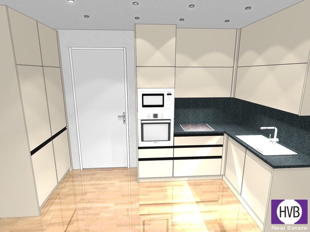 Kuchyňská linka bude vybavena indukční varnou deskou, myčkou, lednicí, troubou a mikrovlnnou troubou. V obývacím pokoji je podlahové topení.