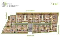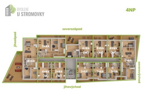 Bytové jednotky s dispozicí 1+kk nabídnou čisté užitné plochy od 33 m2 až do 41 m2 (plochy bez balkonů a sklepů). Interiér je navržen s důrazem na světlost, praktičnost a celkový komfort bydlení. Mimo sklepní kóji má každý byt navíc lodžii, balkon nebo terasu od výměr 3 m2 do 9 m2. K bytům je možné dokoupit vlastní parkovací místo ať už v garáži, či venku.