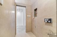 Koupelna byla zrealizována v nadstandardním provedení: rektifikovaná dlažba Ecoceramic 60×120, sprchová vana Ronal z litého mramoru, sprchová zástěna s Antiplaque úpravou a podomítkový systém Geberit u WC.