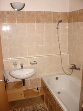 koupelna – umyvadlo, vana, skříňka, zrcadlo, otopný žebřík,
