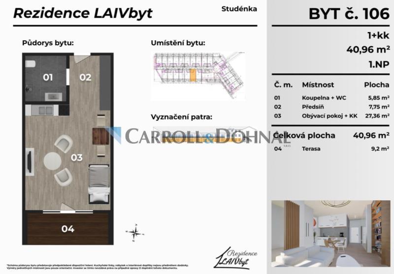 V rámci nového projektu Byty Studénka nabízíme moderní a útulné byty 1+kk, které jsou výbornou volbou jak pro řešení vlastního bydlení i jako výhodná investice. Čeká vás komfortní domov v klidném prostředí s blízkostí přírody a zároveň s výbornou dostupností do centra. Byt č. 106 se nachází v 1. NP, má dispozici 1+kk a užitnou plochu 40,9 m. K bytu náleží terasa o velikosti 9,2 m a předzahrádka 15 m, což zajišťuje příjemné venkovní zázemí. Proč právě tento byt? Skvělá poloha centrum Studénky v docházkové vzdálenosti, Ostrava do 20 minut. Škola a školka přes cestu. Kompletní občanská vybavenost obchody, zdravotní péče i sportovní možnosti v blízkém okolí. Moderní standard bydlení světlé interiéry, praktické dispozice, kvalitní materiály a nízké provozní náklady. Výborná dostupnost dopravy rychlé spojení vlakem, autobusem i autem. Projekt Byty Studénka je ideální volbou pro mladé páry, jednotlivce hledající startovací bydlení nebo investory, kteří chtějí jistotu stabilního zhodnocení. Kontaktujte nás pro více informací a sjednání prohlídky.