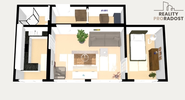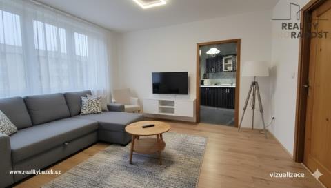 Dispozice bytu jsou - předsíň, obývací pokoj, kuchyně, ložnice, koupelna s toaletou a praktická šatna.