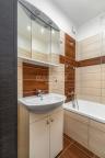 Zděná koupelna nabízí vanu, umyvadlo, zrcadlo a přípojku pro pračku. Toaleta je situována samostatně.