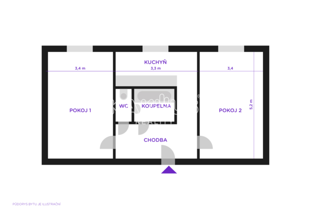 Dispozice bytu je praktická a oblíbená – oba pokoje jsou neprůchozí a orientované do klidného vnitrobloku, což zajišťuje příjemné soukromí i dostatek denního světla.
