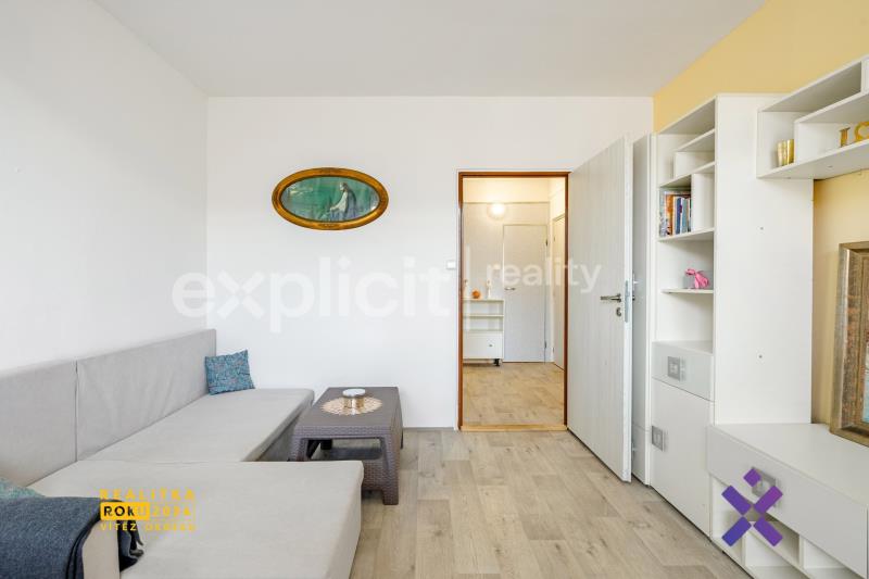 Obývací pokoj o výměře 12 m² je orientovaný na západ a má přímý vstup na lodžii, odkud si můžete vychutnat odpolední kávu i posezení při západu slunce.