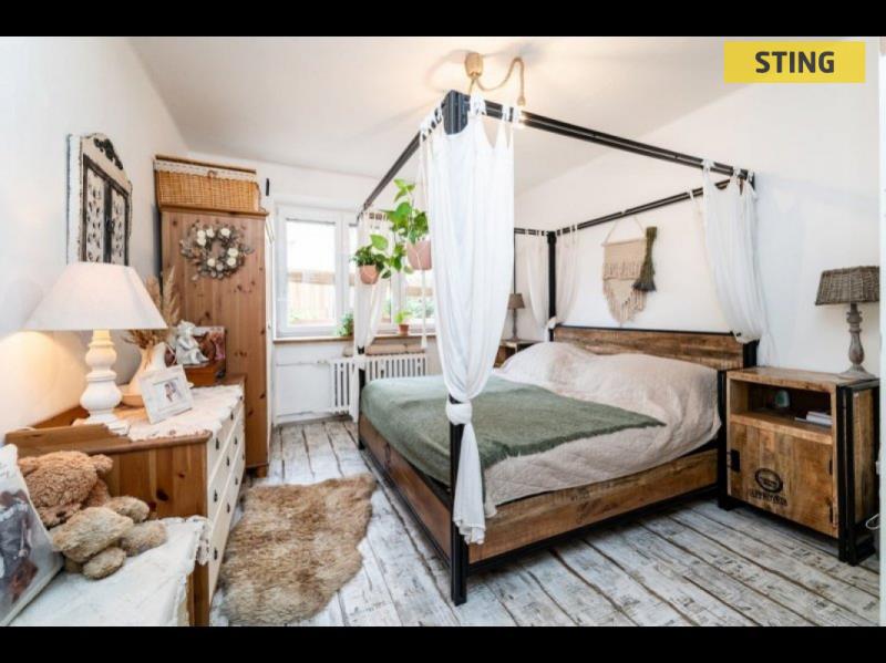 Milovníky masivního nábytku potěší, že stylové vybavení, které dotváří jedinečnou atmosféru bytu, je součástí prodeje.