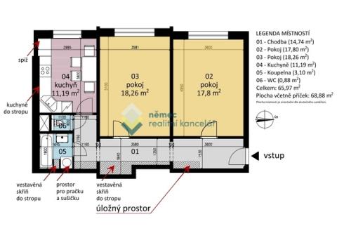 Hledáte větší a zrekonstruovaný byt na skvělém místě, v pěší docházkové vzdálenosti od stanice metra? V osobním vlastnictví, v rychlé dojezdové vzdálenosti do centra Prahy? Pak Vás bude zajímat prodej velmi světlého a prostorného bytu 2+1 o celkové ploše 70,88 m² vč. příslušenství (sklep 2 m²) umístěného ve 4. podlaží (3. patře) renovovaného domu s výtahem ve velmi žádané lokalitě Prahy 10 - Strašnic, ul. Sečská. Tato 2+1 prošla v roce 2021 náročnou generální rekonstrukcí veškerých vnitřních povrchů, rozvodů a bytového jádra. Projekt rekonstrukce včetně podrobné fotodokumentace průběhu k dispozici. Laděn je dekory do moderní a nadčasové kombinace bílé, šedé, černé a dřeva. Oceníte zejména renovované parkety, velkorysé úložné prostory a výhled do zeleně všude kolem. Dispozice tohoto západně orientovaného bytu: Dva nadstandardně velké neprůchozí pokoje (17,80 a 18,26 m²) - dřevěné parkety, okna opatřena fólií Next proti přehřívání v létě Kuchyně (11,19 m²) – kuchyňská linka řešená truhlářem na míru, skříňky až do stropu, praktický rohový granitový dřez značky Franke, odvětrávaná prostorná spíž, plynová varná deska, elektrická trouba s minutkou, vestavěná lednice, digestoř, na podlaze vinyl, prostorný jídelní stůl v dekoru kuchyně. Koupelna (3,10 m²) – kvalitní vana Kaldewei Saniform Plus 170x70 cm smaltovaná ocel s Perl-effektem, prostorné umyvadlo Laufen Pro S 60×46,5 cm s velkým zrcadlem se světlem, koupelnová vestavěná skříň na hygienické potřeby, poličky s LED osvětlením za vanou. Příprava na hlubokou pračku i sušičku. Chodba (14,74 m²)– oddělená vchodová zóna s dlažbou, čistá zóna se zátěžovým kobercem, vestavěné skříně, podhled s LED panely. Nové rozvody elektro vedené v podhledu. Byt je umístěn na velmi strategickém místě - výborná dostupnost MHD (stanice metra Strašnická 7 minut chůze - spojení jen 10 minut do centra; zastávka autobusu Štěchovická 2 minuty chůze od domu). Veškerá občanská vybavenost v místě bydliště - škola i školka za rohem, stejně tak Park Gutovka (beachvolleybal, bruslení, lezecká stěna, dopravní hřiště..). Obchody Billa, Tesco i Albert jsou po ruce. Za zmínku stojí i Sokol Strašnice (sport pro děti i dospělé.). Klidná, tichá, čistá lokalita (nejsou slyšet tramvaje ani auta), zeleň všude kolem. Jedná se o velmi dobře fungující SVJ, které má dostatečnou rezervu ve fondu oprav a má opravdu vše zrenovováno (nové vstupní dveře, čipy, výtah...). PENB - C, úsporná. Vřele doporučujeme, bližší info v RK.