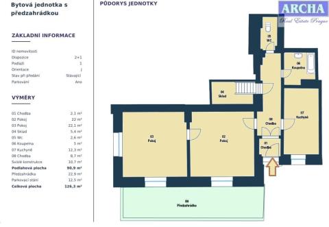 Podlahová plocha bytu činí 90,9 m2, celková plocha činí 126,3 m2 a díky orientaci na jih je prostor krásně prosvětlený po celý den.