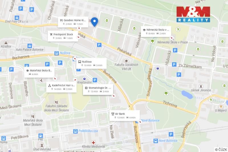 Světlý, prostorný byt 2+kk o rozloze 59 m² z roku 2017 rezidenční čtvrti Botanika v Jinonicích, ve výborném stavu. Skládá se ze vstupní haly s vestavnou skříní, ložnice a obývacího pokoje s kuchyňským koutem. Dále koupelny s vanou a samostatné toalety. Majitel má ve výhradním užívání terasu o rozloze 5,5 m² a předzahrádku o rozloze 60 m², která je součástí nemovitosti. Jedná se o nízkoenergetický dům (třída B) se sběrem dešťové vody k zalévání zahrady, s recyklovanou vodou k použití na toaletě, solárními panely na střeše, bezbariérovým přístupem. Nízké měsíční náklady: 4400 Kč + elektřina. Podlahy jsou dřevěné, příprava pro elektrické žaluzie, dveře Sapeli v interiéru, okna a terasové dveře Vekra, bezpečnostní vstupní dveře, plně vybavená moderní kuchyň. Německá škola 500 metrů, zastávka autobusu 2 minuty chůze, stanice metra Nové Butovice nebo Hůrka 10 minut chůze, park Vidoule/Cubulka.