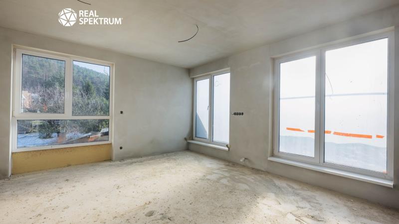 Dispozice: chodba (7,9 m²), pokoj s kuchyňským koutem (26,7 m²), pokoj (12,7 m²), koupelna s WC (4,8 m²), terasa vč. zatravnění (89,8 m²), sklepní kóje (3,6 m²), parkovací stání (13,9 m²)
