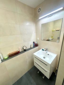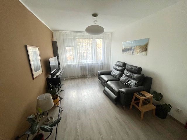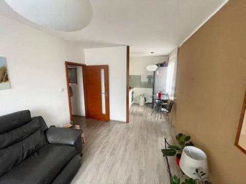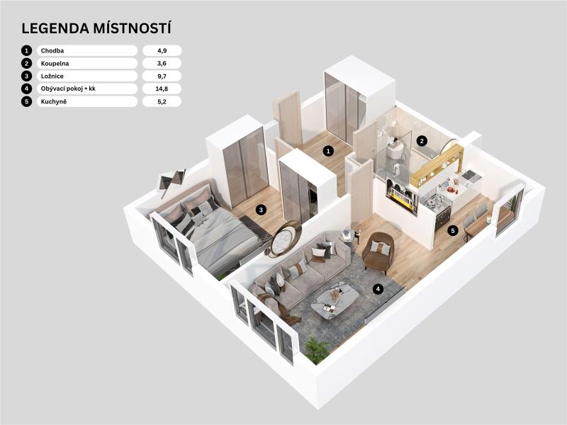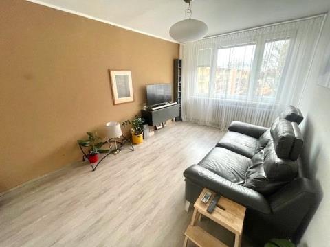 Po vstupu do bytu se ocitnete v chodbě o ploše 4,9 m2, z které se hned po pravé straně vstupuje do ložnice o ploše 3,6 x 2,7 m ( 9,7 m2 ), hned proti vstupním dveřím bytu se nachází koupelna o ploše 3,6 m2 se sprchovým koutem, umývadlem a toaletou. Z chodby je rovněž vstup do obývacího pokoje o ploše 4,8 x 3,1 m ( 14,8 m2 ), který je propojen s kuchyňským koutem o ploše 2,25 x 2,3 m ( 5,2 m2 ), kde je umístěna kuchyňská linka s vestavěnými spotřebiči ( horkovzdušná trouba, varná deska plynová, odsavač par, mikrovlnná trouba ). Na podlaze všech místností, včetně chodby je položena vinylová podlaha, v koupelně s toaletou je na podlaze dlažba. Orientace ložnice a obývacího pokoje je na východ, kuchyňský kout je orientován na sever. V bytě je zavedena telefonní přípojka s možností instalace kabelové televize a internetu, panelový dům má svojí vlastní plynovou kotelnu. K bytové jednotce ještě přináleží sklep o ploše 1,9 m2.