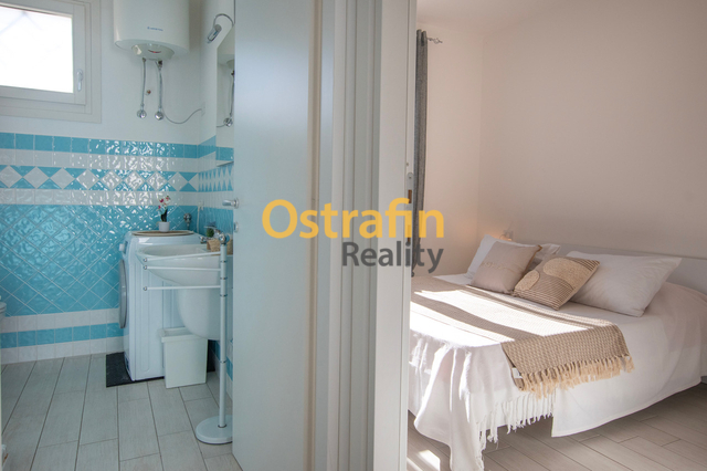Dispozice zahrnuje světlou ložnici, koupelnu se sprchovým koutem a obývací prostor s kuchyňským koutem, který plynule navazuje na krytou terasu s dechberoucím výhledem na moře a okolní kopce.