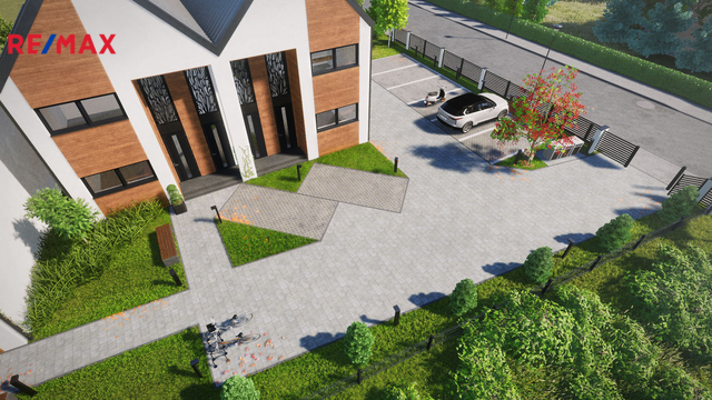 Celý areál je oplocený, kompletně dokončené terénní úpravy s výsadbou zeleně, zámkovou dlažbou a moderním oplocením zaručují klid, soukromí a vysoký standard bydlení.