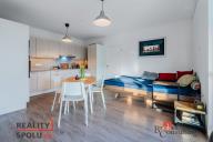 • světlý obývací pokoj s kuchyňským koutem a plně vestavěnými spotřebiči