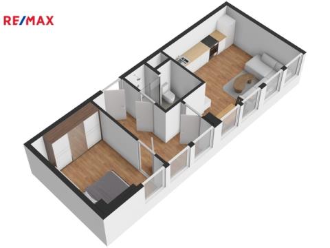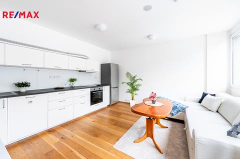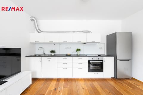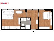 Byt se skládá ze vstupní chodby, obývacího pokoje s kuchyňským koutem, samostatné ložnice a koupelny s WC. Kuchyňská linka je vybavena vestavěnými spotřebiči – elektrickou varnou deskou, elektrickou troubou, myčkou nádobí a digestoří. Koupelna disponuje sprchovým koutem, umyvadlem a plnohodnotným místem pro pračku i sušičku. Vytápění a ohřev vody jsou řešeny dálkově.