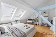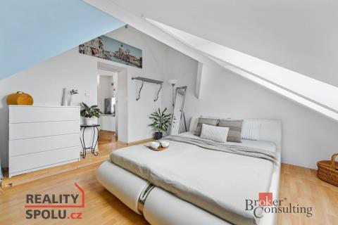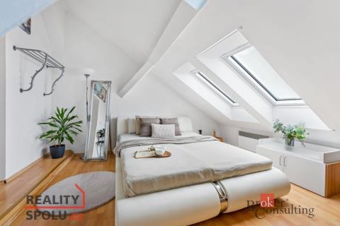Celý prostor působí velmi příjemně a domácky. Především díky své dispozici a samostatné ložnici v podkroví. Ta má opravdu osobitý charakter, který tvoří nepřiznané trámy, střešní skosení a plastová okna Velux s markýzou proti slunci ve střeše - měněná v předchozím roce.