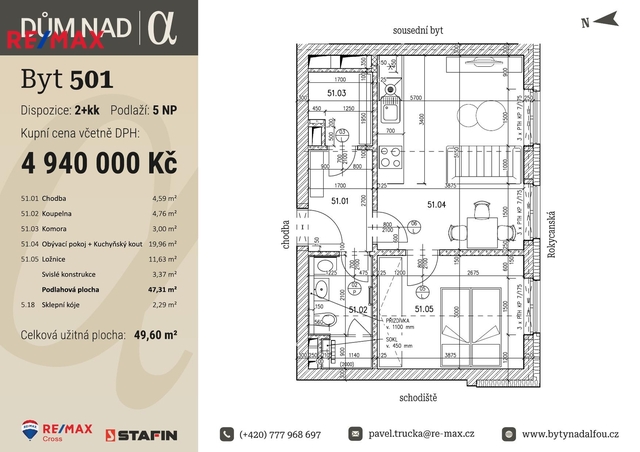 Celková užívaná plocha činí 49,60 m2 a sestává z podlahové plochy bytu 47,31 m2 vč. svislých konstrukcí 3,37 m2 a sklepní kóje na patře o výměře 2,29 m2. Tento byt tvoří obývací pokoj s prostorem pro kuchyňskou linku o výměře 19,96 m2, ložnice o výměře 11,63 m2, koupelna se sprchovým koutem a WC o výměře 4,76 m2, komora o výměře 3,00 m2 a chodba o výměře 4,59 m2. Momentálně si lze v uvedené ceně vybrat doplňky jako podlahové krytiny, dekor dveří, obklady, dlažby a sanitu, a to ze zvolených standardů, popř. si připlatit za jiné dle vašeho výběru.