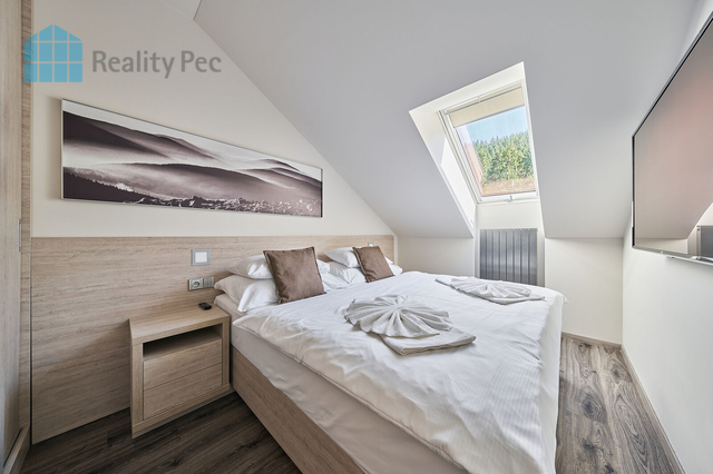 Nabízíme k prodeji luxusní, dvoupatrový mezonetový byt o dispozici 2 + kk se dvěma koupelnami v samém centru Pece pod Sněžkou. Tento kompletně vybavený byt se nachází v Hotelu Pecr Deep a byt je možno využívat k vlastnímu bydlení, ale i ke krátkodobým i dlouhodobým pronájmům prostřednictvím skvěle fungující servisní společnosti. Byt nabízí neopakovatelný zážitek luxusního bydlení v kombinaci se skvělou gastronomií a rekreací v srdci Krkonoš. Byt se nachází ve 4. a 5. podlaží 5-podlažního cihlového objektu a disponuje podlahovou plochou 52 m². K dispozici je také terasa o rozloze 1.8m² s úchvatným výhledem na okolní krajinu. Zcela kompletní vybavení celého apartmánu je , moderní, funkční a nabízí obývací pokoj s kuchyňským koutem včetně vybavení, ložnici, komoru a dokonce dvě koupelny s toaletou . K bytu náleží parkovací místo v parkovací garáži a soukromý skibox odkud se do bytu pohodlně dostanete výtahem. Byt se prodává do osobního vlastnictví, v domě je funkční společenství bytových jednotek a zároveň je možno využívat hotelových služeb jako je úklid, výměna ložního prádla či skvělá snídaně v restauraci v přízemí objektu. Samostatné měření energií, připojení k internetu optickým kabelem a dvě TV jsou samozřejmostí. Tento byt nabízí nejen exkluzivitu a luxus, ale také vynikající umístění v srdci přírody s jedinečnými možnostmi sportovního vyžití a relaxace. Ideální pro náročné klienty, kteří ocení kombinaci elegance, komfortu a jedinečného životního stylu. Rádi zodpovíme Vaše dotazy nebo Vás jako místní obyvatelé přivítáme v Peci a byt osobně ukážeme. Neváhejte nás kontaktovat a domluvit si prohlídku.