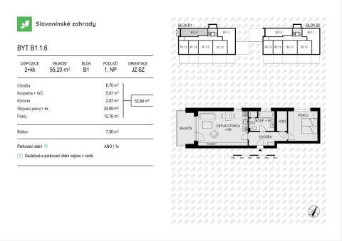 Nabízíme prostorný byt s označením B1.1.6 o dispozici 2+kk, podlahové ploše 55,15 m2 v 1. NP, s terasou 7,9 m2 ideální pro páry nebo jako investiční bydlení.