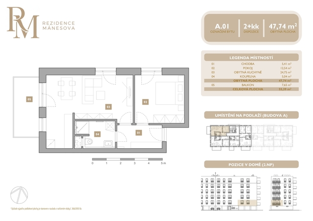 Světlý a moderně řešený byt 2+kk s balkonem v projektu Rezidence Mánesova v Lipníku nad Bečvou představuje ideální volbu pro páry, mladé rodiny nebo investory. Byt je vybaven vinylovými podlahami, teplovodním podlahovým vytápěním, kuchyňskou linkou v ceně bytu, přípravou pro venkovní žaluzie a u bytů ve 4.–6. NP také přípravou na klimatizaci. Interiérové prvky je možné zvolit ve světlé (2NP, 4NP, 6NP) nebo tmavé variantě (3NP, 5NP). Součástí prodeje je nutnost zakoupení venkovního parkovacího stání, k bytu lze dále dokoupit sklepní kóji. Rezidence se nachází v klidné části města s kompletní občanskou vybaveností – obchody, školy, restaurace i zastávka veřejné dopravy jsou v docházkové vzdálenosti. Byty 2+kk kombinují kvalitní zpracování, příznivou cenu a moderní styl bydlení. Dokončení výstavby 12/2026.