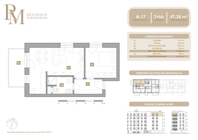 Světlý a moderně řešený byt 2+kk s balkonem v projektu Rezidence Mánesova v Lipníku nad Bečvou představuje ideální volbu pro páry, mladé rodiny nebo investory. Byt je vybaven vinylovými podlahami, teplovodním podlahovým vytápěním, kuchyňskou linkou v ceně bytu, přípravou pro venkovní žaluzie a u bytů ve 4.–6. NP také přípravou na klimatizaci. Interiérové prvky je možné zvolit ve světlé (2NP, 4NP, 6NP) nebo tmavé variantě (3NP, 5NP). Součástí prodeje je nutnost zakoupení venkovního parkovacího stání, k bytu lze dále dokoupit sklepní kóji. Rezidence se nachází v klidné části města s kompletní občanskou vybaveností – obchody, školy, restaurace i zastávka veřejné dopravy jsou v docházkové vzdálenosti. Byty 2+kk kombinují kvalitní zpracování, příznivou cenu a moderní styl bydlení. Dokončení výstavby 12/2026.