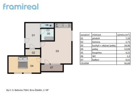 K prodeji, Byt 2+kk, 61 m2 Brno, Černovice