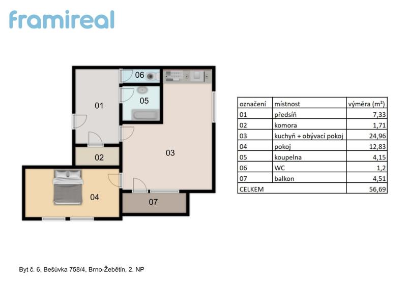 Byt je situovaný v klidné a vyhledávané lokalitě Brno-Žebětín, na ulici Bešůvka. Nachází se ve 2. nadzemním podlaží moderního bytového domu a díky nárožní orientaci na jih je krásně prosvětlený po celý den. K bytu náleží i parkovací stání přímo u domu v hodnotě 200 000 Kč, které je součástí prodeje – což je v této oblasti výrazná výhoda. Byt potěší svou úsporností – celkové měsíční náklady se pohybují okolo 3 000 Kč při dvoučlenné domácnosti. Velkou předností Žebětína je jeho zasazení do zeleně – okolní lesy a rybník přirozeně ochlazují prostředí, takže je zde v létě znatelně příjemněji než v přehřátém centru města. Zároveň nabízí skvělé možnosti pro aktivní odpočinek – cyklostezky, stezky zdraví i relaxaci u Žebětínského rybníka. Přitom je centrum Brna pohodlně dostupné MHD do 20 minut. V místě je kompletní občanská vybavenost – školka, škola, obchody, restaurace i sportovní zařízení. Dispozičně je byt velmi dobře řešen – obývací pokoj s kuchyňským koutem je propojený s balkonem orientovaným do klidné části a nabízí příjemný prostor pro odpočinek i společné chvíle. Ložnice je oddělená, koupelna disponuje vanou, WC je samostatné. Nechybí ani praktická komora přímo v bytě, ideální pro uložení sezónních věcí, sportovního vybavení nebo jako menší domácí sklad. Komfort bydlení zvyšuje také instalovaná klimatizace, která zajišťuje příjemné teploty i během horkých letních dní. Byt je ve velmi dobrém stavu, připravený k okamžitému nastěhování bez dalších investic. Vhodný pro vlastní bydlení i jako výhodná investice k pronájmu. Cena za byt: 6 890 000 včetně parkovacího stání Provize RK: 200.000,- Kč Budeme se těšit na osobní prohlídce.