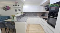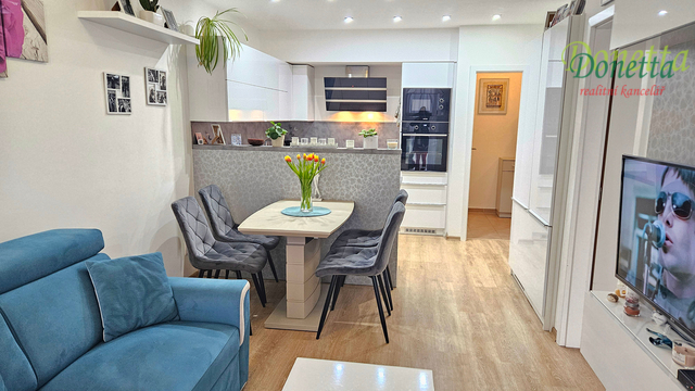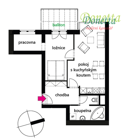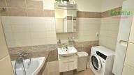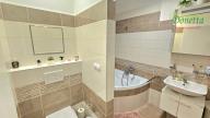 Dispozice: vstupní chodba s úložnou šatní skříní, koupelna s rohovou vanou, umyvadlem, prostorem pro pračku, žebříkovým radiátorem a toaletou se závěsným WC, obývací pokoj s kuchyňským koutem a jídelní částí, ložnice s balkonem, úložná komora/šatna, která je využívána jako pracovna a sklep v přízemí domu. Podlahová krytina v chodbě a koupelně je dlažba, pokoje mají laminátovou plovoucí podlahu.