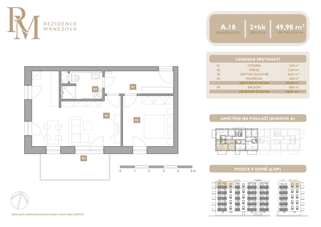 Světlý a moderně řešený byt 2+kk s balkonem v projektu Rezidence Mánesova v Lipníku nad Bečvou představuje ideální volbu pro páry, mladé rodiny nebo investory. Byt je vybaven vinylovými podlahami, teplovodním podlahovým vytápěním, kuchyňskou linkou v ceně bytu, přípravou pro venkovní žaluzie a u bytů ve 4.–6. NP také přípravou na klimatizaci. Interiérové prvky je možné zvolit ve světlé (2NP, 4NP, 6NP) nebo tmavé variantě (3NP, 5NP). Součástí prodeje je nutnost zakoupení venkovního parkovacího stání, k bytu lze dále dokoupit sklepní kóji. Rezidence se nachází v klidné části města s kompletní občanskou vybaveností – obchody, školy, restaurace i zastávka veřejné dopravy jsou v docházkové vzdálenosti. Byty 2+kk kombinují kvalitní zpracování, příznivou cenu a moderní styl bydlení. Dokončení výstavby 12/2026.