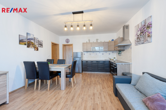 - Velký obývací pokoj s kuchyňským koutem, který tvoří hlavní obytný prostor apartmánu