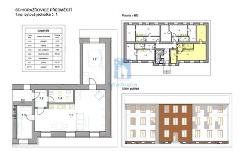 Nabízíme k prodeji prosvětlený byt 2+KK s šatnou, o velikosti 59,5 m², který se nachází na klidné adrese v ulici Předměstí, v malebné části obce Horažďovice, okres Klatovy. Byt je ideálním spojení moderního životního stylu s pohodlím maloměsta. Byt se nachází v 1. patře třípatrového objektu a je po kompletní rekonstrukci, což zaručuje nejen estetickou hodnotu, ale také vysoký standard bydlení. Zateplení domu 160 mm vatou. Interiér bytu se vyznačuje prosvětlenými místnostmi a pečlivě vybranými materiály, které umocňují jeho nadstandardní charakter. Podlahy zateplené, povrch vinyl a dlažba. Kromě moderního designu a prvotřídní kvality provedení vás jistě osloví také výhled z oken, který nabízí pohled na okolní zeleň a klidné prostředí, perfektní pro život v harmonii s přírodou. Elektřinu zajišťuje firma ČEZ, vodu a kanalizaci spravuje firma Čevak. Teplo zajištěno přes tepelné čerpadlo, každý byt má samostatné měření. Příjezdová komunikace je dobře dostupná jak pro osobní automobily, tak pro veřejnou dopravu, a to díky blízkosti vlakového a autobusového spojení, což občanům poskytuje flexibilitu a komfort při cestování. Tento byt představuje nejen investici do kvalitního bydlení, ale také příležitost pro ty, kdo hledají klidné místo pro život s výbornou dostupností do větších měst. Dokončení bytů je plánováno na druhé čtvrtletí roku 2026. K bytu je možné přikoupit parkovací místo a sklep. V nabídce máme celkem 10 bytových jednotek o velikostech od 38 m2 do 65,3 m2 s dispozicemi 2+KK a 3+KK.