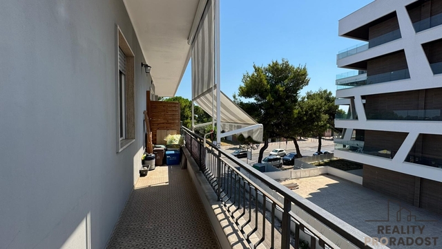 Z obývacího prostoru je přímý vstup na rohový balkon, který je vybaven novými markýzami, praktickou šatní skříní včetně kontrolního světla a pračky.