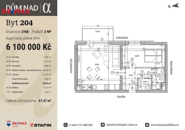 Celková užívaná plocha činí 67,47 m2 a sestává z podlahové plochy bytu 59,53 m2 vč. svislých konstrukcí 3,64 m2, balkonu 5,55 m2 a sklepní kóje na patře o výměře 2,39 m2. Tento byt tvoří obývací pokoj s prostorem pro kuchyňskou linku o výměře 28,56 m2, ložnice o výměře 14,25 m2, koupelna se sprchovým koutem a WC o výměře 3,88 m2, komora o výměře 2,21 m2 a chodba o výměře 6,99 m2. Momentálně si lze v uvedené ceně vybrat doplňky jako podlahové krytiny, dekor dveří, obklady, dlažby a sanitu, a to ze zvolených standardů, popř. si připlatit za jiné dle vašeho výběru.