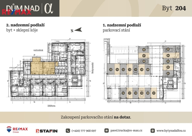 Ve společném garážovém prostoru se bude nacházet několik parkovacích míst, o jejichž aktuální dostupnosti Vám poskytneme více informací na dotaz.