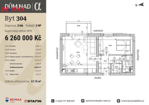 Celková užívaná plocha činí 67,76 m2 a sestává z podlahové plochy bytu 59,92 m2 vč. svislých konstrukcí 3,94 m2, balkonu 5,55 m2 a sklepní kóje na patře o výměře 2,29 m2. Tento byt tvoří obývací pokoj s prostorem pro kuchyňskou linku o výměře 28,70 m2, ložnice o výměře 14,43 m2, koupelna se sprchovým koutem a WC o výměře 3,75 m2, komora o výměře 2,20 m2 a chodba o výměře 6,90 m2. Momentálně si lze v uvedené ceně vybrat doplňky jako podlahové krytiny, dekor dveří, obklady, dlažby a sanitu, a to ze zvolených standardů, popř. si připlatit za jiné dle vašeho výběru.