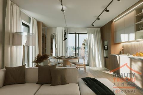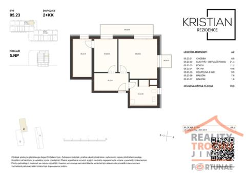 V novém developerském projektu Rezidence Kristian nabízíme prodej, moderního a nízkoenergetického bydlení v bytu 2+kk s balkónem (2x) a vnitřním parkovacím stáním ve vyhledávané lokalitě v Hradci Králové – Moravské Předměstí. Bytová jednotka se nachází ve 4. NP zděného bytového domu, celková užitná plocha 70,9 m2, 1. balkón 7,6 m2, 2. balkón 1,8 m2, šatna 10,6 m2. Dispozice: vstupní chodba, obývací pokoj s kuchyňským koutem, jídelnou, ložnicí, koupelna s WC. Vytápění: ústřední dálkové. K bytu náleží 1x vnitřní parkovací stání. Ve standardním provedení: plastová okna hranatá s izolačním trojsklem, vinylové podlahy KPP – výběr z 12 typů dekorů, koupelna s keramickou dlažbou La Ceramica Factory – výběr ze 4 dekorů, obklady Rako Systém, umyvadlo keramické se stojánkovou pákovou baterií, vana bílá akrylátová obdélníková. WC závěsné bílé. Použité materiály kombinují moderní technologie a udržitelnost a především snižují energetické náklady. Bytová jednotka se nachází na Moravském Předměstí v novostavbě bytového domu v Rezidenci Kristian. Výhodou lokality je veškerá občanská vybavenost v místě a výborná dopravní dostupnost. Pěkné, klidné bydlení pro rodinu s dětmi. Parkování je zajištěno v podzemních garážích a venkovních parkovištích přímo v rezidenci. Bližší informace Vám rádi sdělíme v realitní kanceláři. Máme pro Vás připraveny informace k hypotečnímu úvěru, který vyřídíme podle Vašich požadavků.