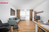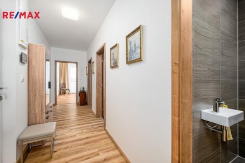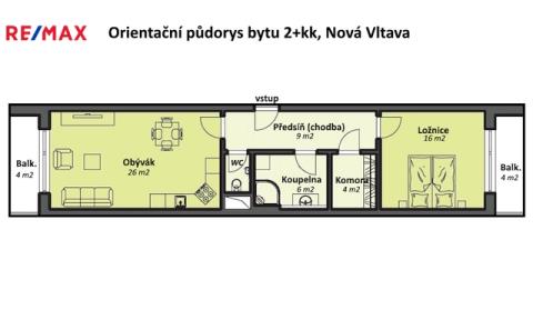 Dispozice bytu (podlahová plocha 64,3 m2) sestává z prostorné vstupní chodby, východně orientovaného obývacího pokoje s kuchyňským koutem (nová kuchyňská linka kompletně vybavena spotřebiči – varná deska + trouba, myčka, lednice) a přímým vstupem na balkon (4,3 m2), dalšího samostatného pokoje (ložnice) se západním výhledem a vstupem na další balkón (4,3 m2), komory (šatna, technická místnost), koupelny se sprchovým koutem, umyvadlem a samostatného WC.