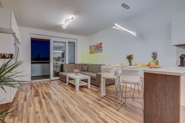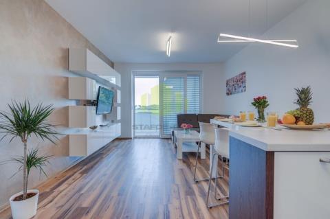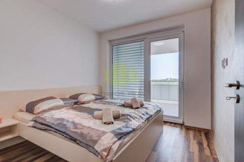Byt má dispozici 2+kk s užitnou plochou 55 m² a navazuje na něj prostorná terasa o výměře 17 m². Dispozičně se skládá z obývacího pokoje s kuchyňským koutem, samostatné ložnice, vstupní haly, šatny, koupelny a oddělené toalety. Obývací pokoj je vybaven moderní kuchyňskou linkou se všemi spotřebiči, mezi které patří indukční varná deska, elektrická trouba, digestoř, mikrovlnná trouba a samostatná lednice s mrazákem. Součástí prostoru je také jídelní stůl pro čtyři osoby s barovými židlemi. Ložnice nabízí komfortní zázemí s masivní manželskou postelí se zdravotními matracemi, nočními stolky, osvětlením s nastavitelnými režimy a dostatkem klidu pro kvalitní odpočinek.
