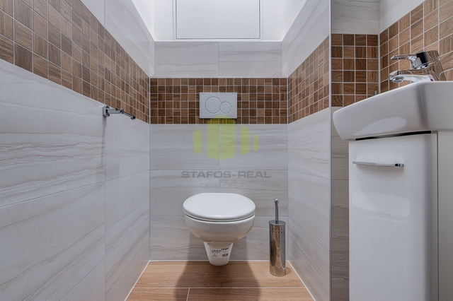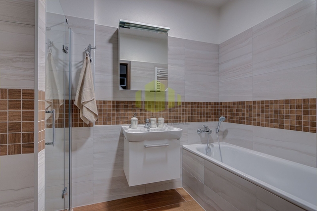 Z obývacího pokoje i ložnice je přímý vstup na prostornou terasu prostřednictvím francouzských posuvných oken, která jsou zejména v letních měsících chráněna venkovními žaluziemi s dálkovým ovládáním. Koupelna je vybavena jak vanou, tak sprchovým koutem a nabízí prostor pro umístění pračky i sušičky. Samostatná toaleta disponuje malým umyvadlem. Ve vstupní hale je umístěn designový botník s věšáky a zrcadlem, v samostatné šatně se nachází praktický úložný systém. V obytných místnostech je položena vinylová podlaha, v koupelně a na toaletě je použita keramická dlažba. Vytápění bytu je řešeno teplovodním podlahovým topením s regulací pomocí termostatu.