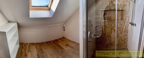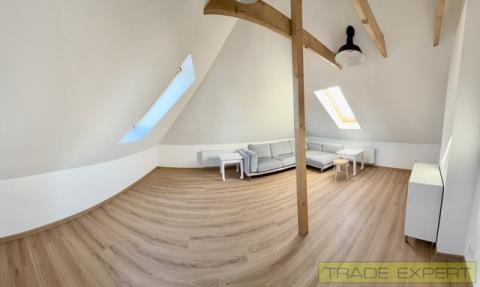 Prodej podkrovního bytu 2+kk, 81 m2, Otmíče, okr Beroun. Bytová jednotka se nachází ve 3. NP kompletně zrekonstruovaného bytového domu: Dispozice: Vstup do bytu z 2. NP. schodiště do 3. NP. zde se nachází hala s pracovním koutem, dále koupelna se sprchovým koutem a WC. Z haly vpravo vstup do podkrovního obývacího pokoje s kuchyňským koutem o výměře 28 m2, vlevo vstup do prostorné ložnice 23 m2. Podlahy v obytných místnostech vinylové, zbytek keramická dlažba. Vytápění bytu a ohřev vody zajištuje tepelné čerpadlo Regulus. Byt je bez kuchyňské linky s možností dodání. Dům je napojen na vodovod, má vlastní čističku odpadních vod. Dešťová voda se po filtraci využívá ke splachování WC. Dům je kompletně zateplen s plastovými okny s trojsklem. Vedle domu je zpevněná plocha s bránou na DO a travní plocha. K bytu je na tomto dvoře vyhrazené parkovací stání. Dům je střežen kamerovým systémem. V obci se nachází Obecní úřad a restaurace. Další služby ve Zdicích, nebo Hořovicích. Nájezd na dálnici D5, 28 km je vzdálen 4 km od domu.