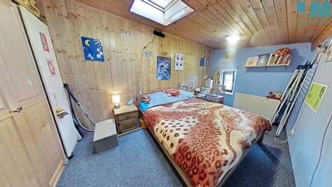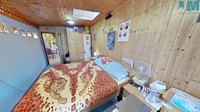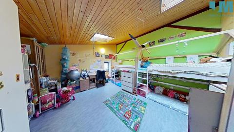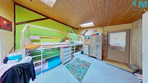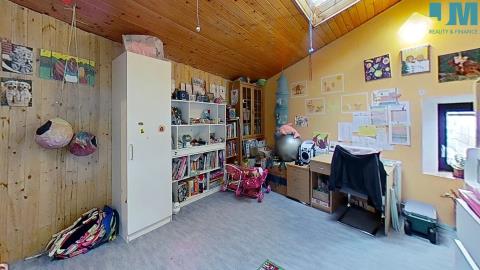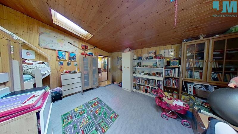 Dominantou bytu je prostorný obývací pokoj s krbem na dřevo, kde se snoubí hřejivé teplo ohně s útulností dřevěných podbitých stropů. Odtud vedou i dveře na balkon s výhledem do klidného vnitrobloku, ideálního pro ranní kávu či večerní posezení. V obýváku se také nacházejí dřevěné schody, které vás zavedou do originálně vytvořeného hracího prostoru – místa, které ocení zejména rodiny s dětmi.