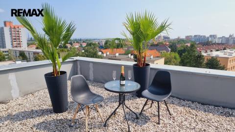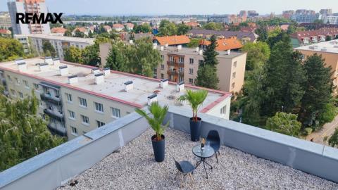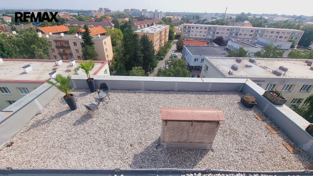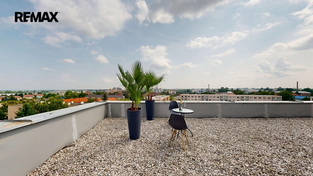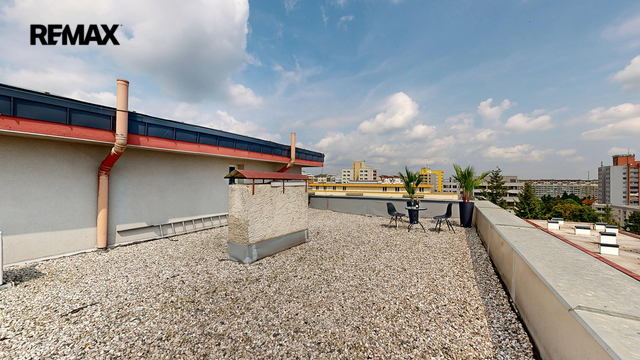 Díky své poloze v nejvyšším podlaží je byt velmi světlý, přičemž místnosti jsou orientovány na jih a sever. Byt má dvě terasy, s jižní orientací 8,4 m² a severní orientací, která má rozlohu bezmála 5,4 m², které umožňují flexibilní využití během dne. Vedle samotného bytu se navíc nachází střešní terasa o velikosti téměř 60 m², na kterou má výhradní přístup pouze majitel bytu. Venkovní prostor je ideální pro odpočinek, relaxaci nebo individuální využití podle potřeb nového majitele.